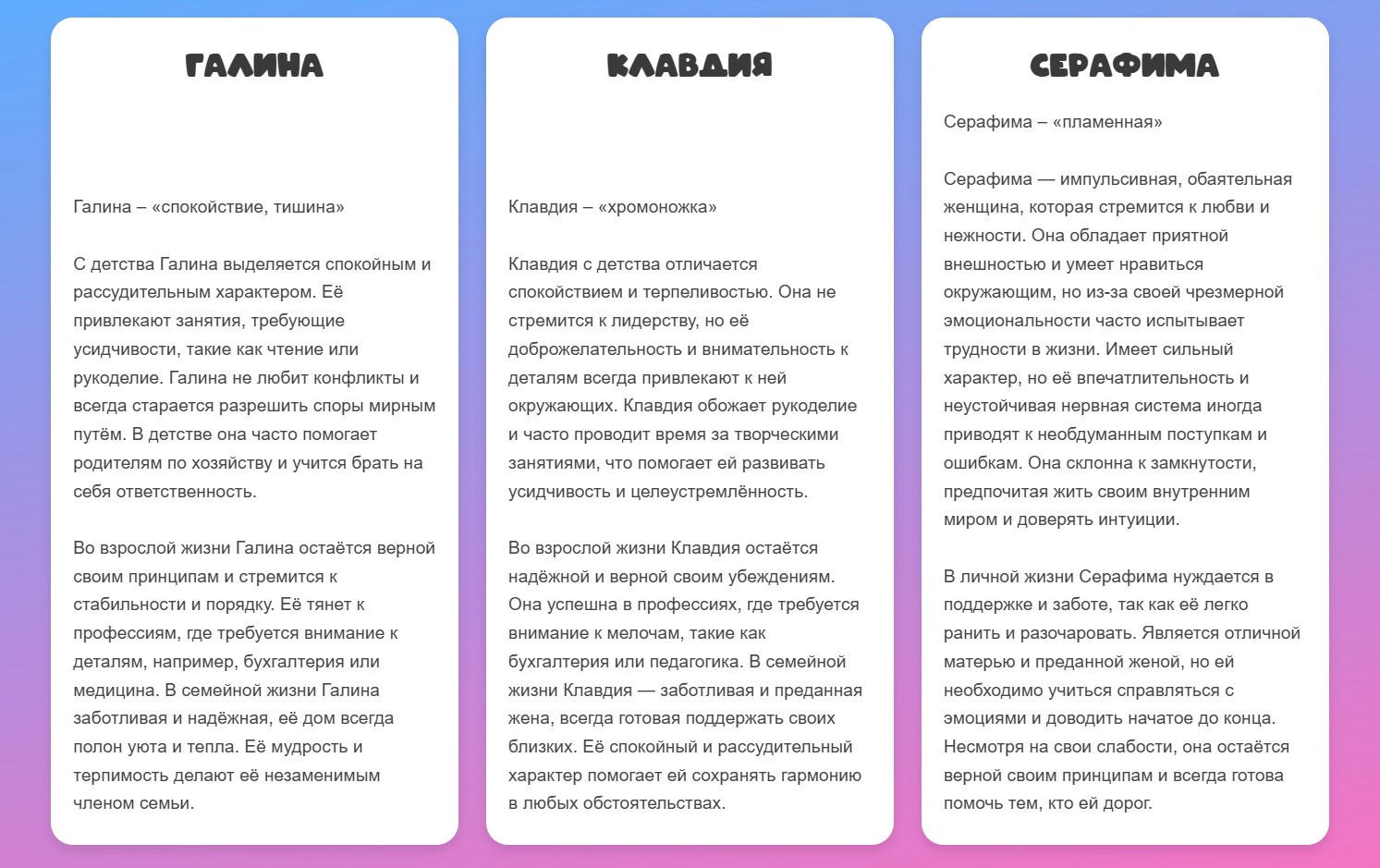 Платформа опирается на ежеквартальные выгрузки ЗАГС по всей России и помечает имя «распространенным», если оно встречается более 500 раз в год. Чтобы имя стало по-настоящему уникальным, Вы можете выбрать параметр «редкое имя», а также стиль: традиционное или трендовое. - Как работает подбор на платформе?